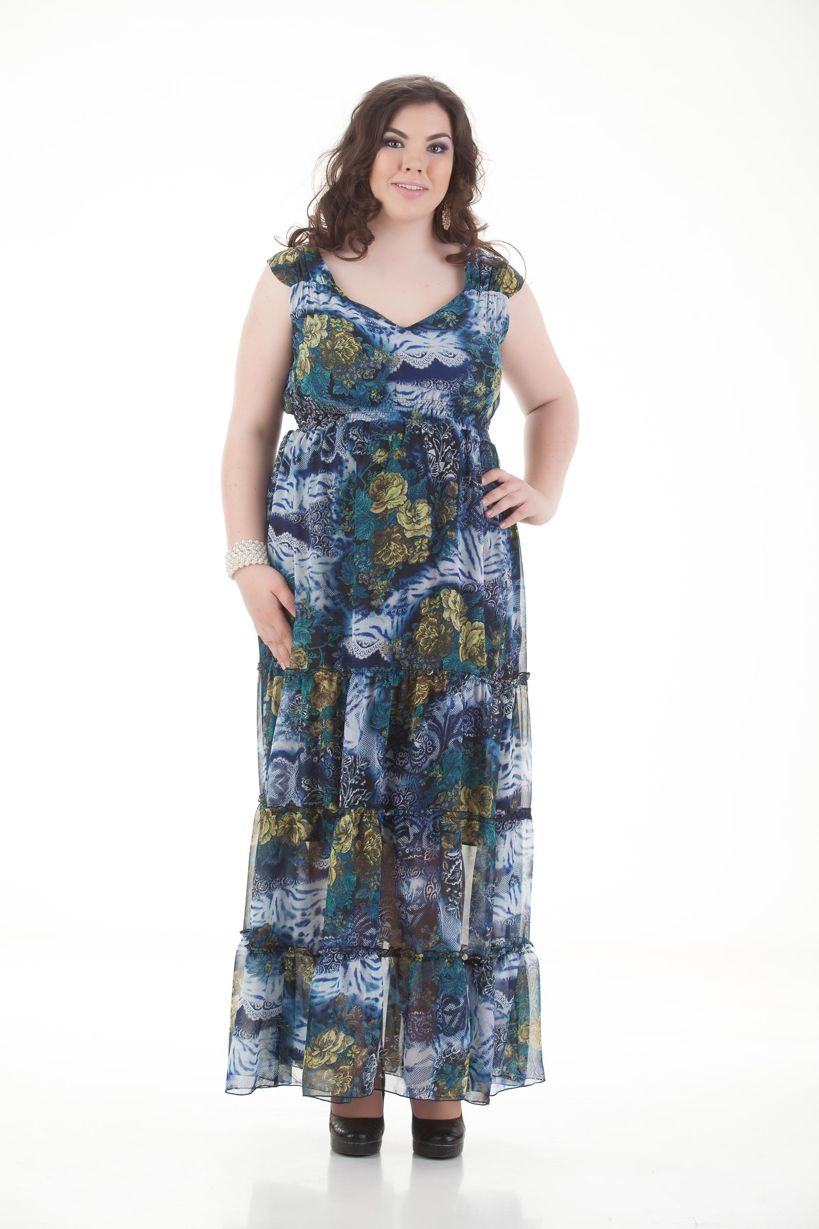 Великолепный, женственный сарафан, полуприлегающего силуэта с актуальной для сезона ЛЕТО 2015 длиной макси. Выполнен из летящего шифона в классической, цветовой гамме черного, белого и легкого серого цветов. Платье имеет актуальный, звериный принт. У платья красивый, V-образный вырез, широкая лямка элегантно закрывает плечо, по поясу предусмотрена резинка, для наилучшей посадки изделия на фигуру. Шикарная, ярусная юбка украшена легкой сборкой, придающей изделию нужную пышность, но не увеличивающими бедра. Платье имеет подклад черного цвета из трикотажного полотна. Обладательница данного наряда всегда будет выглядеть женственно и эффектно.Вид застежки: нет. Силуэт: полуприлегающий.