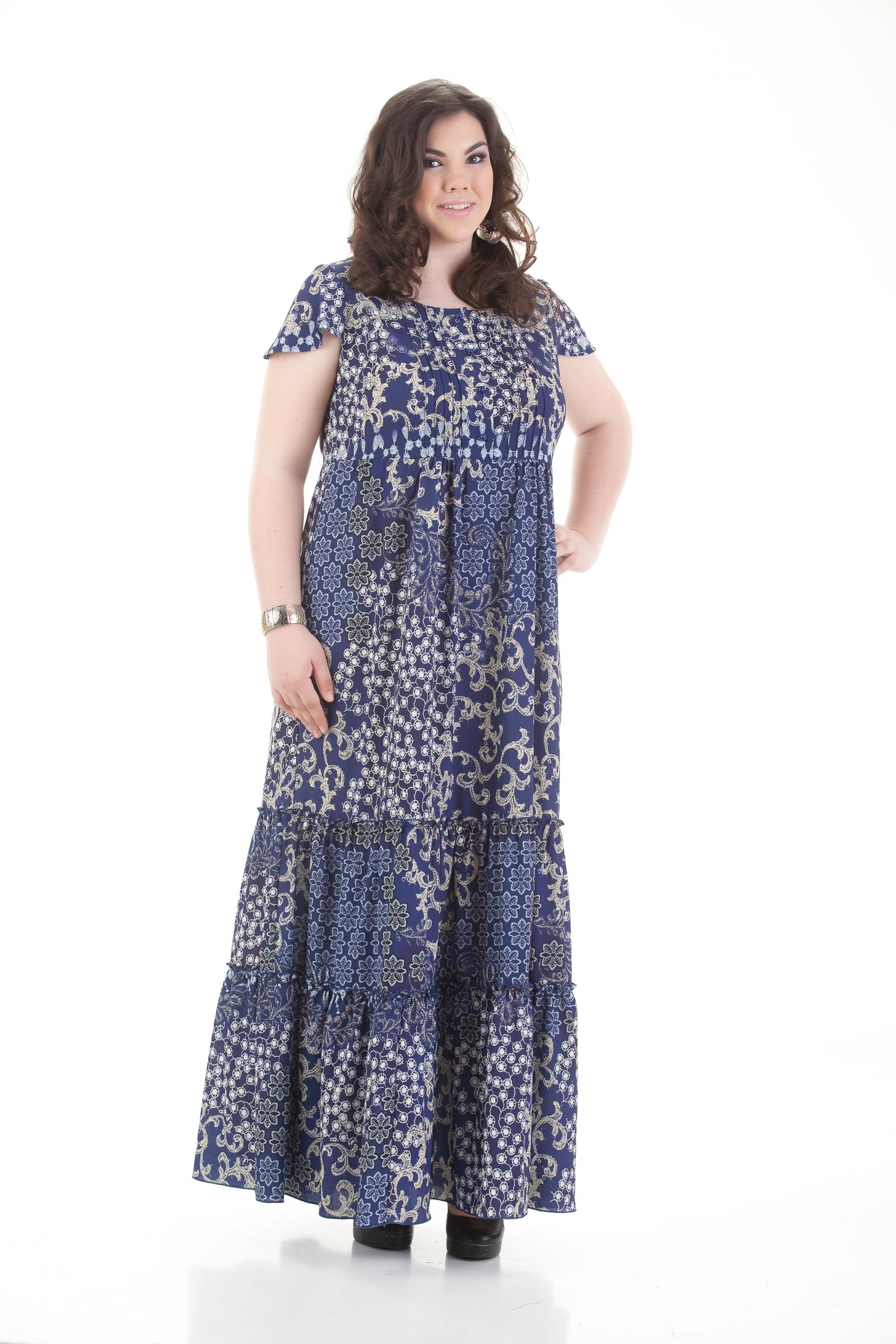 Великолепный, женственный сарафан, свободного силуэта с актуальной для сезона ЛЕТО 2015 длиной макси. Выполнен из летящего мосс крепа в яркой, синей цветовой гамме с эффектом печати 3D. Платье имеет женственный принт жемчуг. У платья красивый лиф с застежкой на пели пуговицы и декоративными застроченными складками.Элегантный рукав, в виде крылышка закрывает плечо. Шикарная, ярусная юбка украшена легкой сборкой, придающей изделию нужную пышность, но не увеличивающими бедра. Юбка начинается от линии завышенной талии, это дополнительно вытягивает силуэт. Хозяйка данного платья будет по настоящему ощущать себя королевой. Вид застежки: петли пуговицы. Силуэт: свободный.