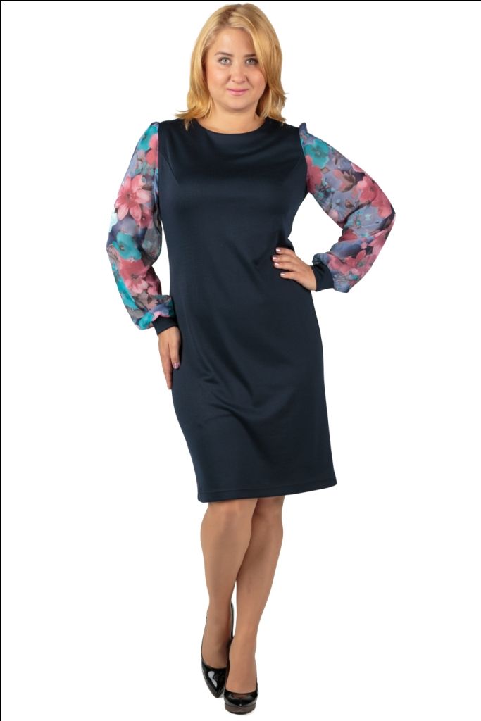 Очаровательное платье с имитацией однотонного платья-футляра, одетого поверх шифоновой блузы с объемным длинным рукавом на широкой манжете из основной ткани. Платье с округлым вырезом горловины и застежкой-молнией на спинке. Отличный вариант для повседневной носки