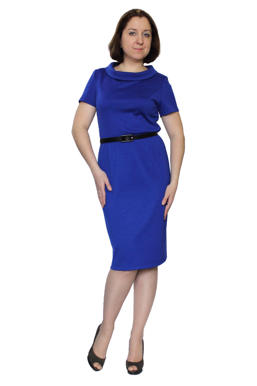 Платье классического силуэта с небольшим рукавчиком, выполненное из однотонного вискозного полотна, отрезное по линии талии. Главным украшением данного платья является отложной воротничек-стоечка красиво обрамляющий вырез горловины. Подходит для создания делового образа
