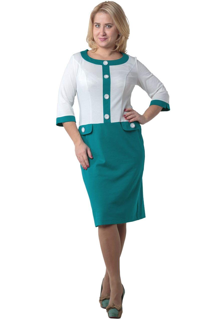 Стильное офисное платье яркой и сочной расцветки с имитацией однотонного жакета молочного цвета с контрастной планкой и манжетами в тон юбки. По полочке платье декорировано накладными клапанами и крупными декоративными пуговицами