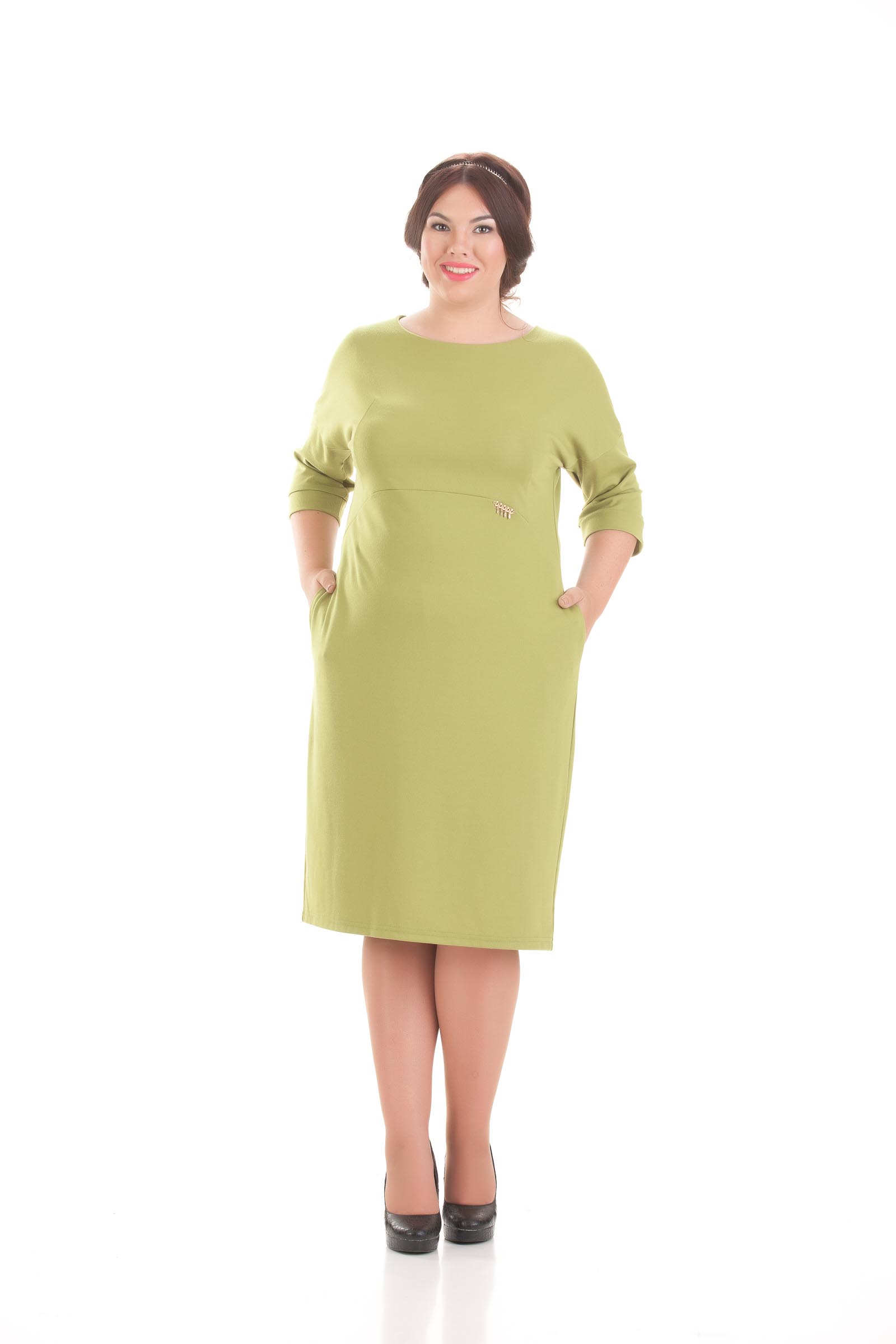 Повседневное, молодежное платье полуприлегающего силуэта. Выполнено из качественного, трикотажного полотна с эластаном. Перед платья состоит из двух деталей, деталь полочки имеет красивый вогнутый вырез горловины и переходит в цельнокроеный, короткий рукав, и имеет красивые грудные выточки. Деталь юбки платья начинается на линии завышенной талии и заужается по длине изделия к середине колена. В боковых швах этой детали предусмотрены удобные карманы. Цельнокроеный, короткий рукав имеет длинную, отрезную манжету, что позволяет добиться нужного удобства в посадке такого рукава, и вносит некоторую изюминку в фасон. По спинке изделия предусмотрены выточки для оптимального прилегания, а так же шлица по спинке юбки. В качестве фурнитуры мы используем красивую, металлическую, пришивную, золотого цвета брошь со стразами производство Турция. Мы предлагаем данное платье в сочных цветах орхидеи, ириса, горчицы, фисташки и бронзы. Данное платье замечательно сидит на фигуре, за счёт своего ультрамодного фасона и великолепной цветовой гаммы поможет создать вам, женственный образ как для работы так и для повседневных прогулок. Особенно хорошо данная модель будет смотреться с сапогами до колена