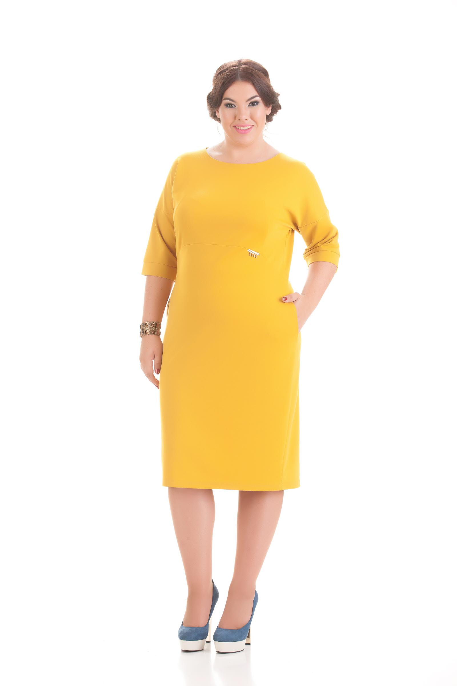 Повседневное, молодежное платье полуприлегающего силуэта. Выполнено из качественного, трикотажного полотна с эластаном. Перед платья состоит из двух деталей, деталь полочки имеет красивый вогнутый вырез горловины и переходит в цельнокроеный, короткий рукав, и имеет красивые грудные выточки. Деталь юбки платья начинается на линии завышенной талии и заужается по длине изделия к середине колена. В боковых швах этой детали предусмотрены удобные карманы. Цельнокроеный, короткий рукав имеет длинную, отрезную манжету, что позволяет добиться нужного удобства в посадке такого рукава, и вносит некоторую изюминку в фасон. По спинке изделия предусмотрены выточки для оптимального прилегания, а так же шлица по спинке юбки. В качестве фурнитуры мы используем красивую, металлическую, пришивную, золотого цвета брошь со стразами производство Турция. Мы предлагаем данное платье в сочных цветах орхидеи, ириса, горчицы, фисташки и бронзы. Данное платье замечательно сидит на фигуре, за счёт своего ультрамодного фасона и великолепной цветовой гаммы поможет создать вам, женственный образ как для работы так и для повседневных прогулок. Особенно хорошо данная модель будет смотреться с сапогами до колена
