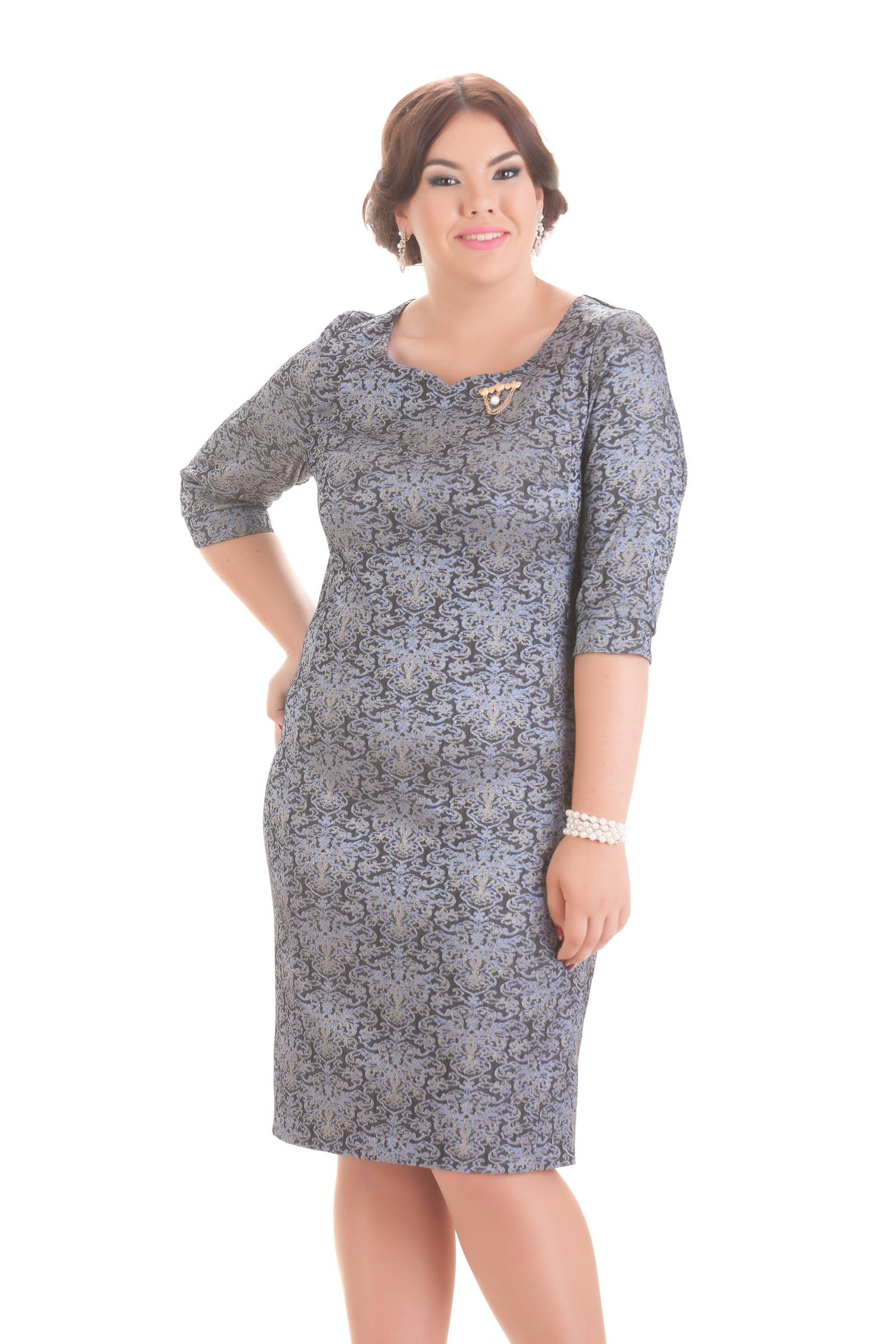 Праздничное, изысканное платье полуприлегающего силуэта типа "футляр". Выполнено из вискозного, упругого, хорошо тянущегося жаккардового полотна с богатой лицевой поверхностью, образованной нитями разного цвета и структуры. Полочка платья имеет красивый, овальный вырез горловины, переходящий в элегантный элемент в виде овальной галочки. Рельефы по переду вытягивают силуэт и делают фигуру зрительно стройнее. Втачной рукав длиной 7/8 имеет оптимальную свободу для наилучшей посадки. По спинке платья предусмотрены выточки для оптимального прилегания, в юбке по спинке предусмотрена шлица. В качестве фурнитуры мы используем красивое, металлическое, золотого цвета, пришивное украшение со стразами и жемчугом производство Турция. Мы предлагаем данное платье в благородном лиловом цвете. Данное платье замечательно сидит на фигуре. Удивительный принт, изысканный фасон и красивая бижутерия помогут создать вам, женственный образ для праздничных мероприятий. Особенно хорошо данная модель будет смотреться с классическими туфлями на высоком каблуке