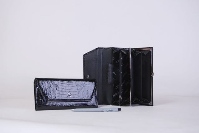 Кошелёк из натуральной кожи. Внутри 5 отделений, из которых один на молнии и один на замке. Имеется отделение для визитных карточек. На задней стенке карман. Закрывается на кнопку.